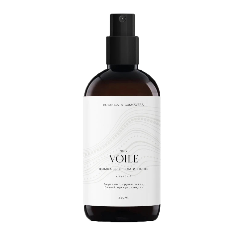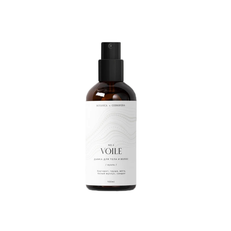 При распылении Voile превращается в нежное облако, обволакивающее кожу и волосы шелковистой вуалью. Кожа ощущается увлажненной, напитанной, гладкой — как после сыворотки, но без следов. Волосы обретают живой блеск, мягкость и воздушность, легко расчесываются, статическое электричество исчезает.